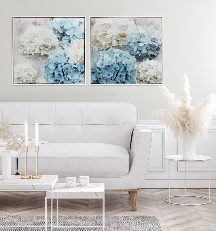 This exquisite painting showcases a collection of hydrangea blossoms in soft, muted tones of pale blue, ivory, and delicate lavender. The fluffy, voluminous petals are rendered with a light, ethereal quality, giving the flowers a dreamy, almost cloud-like appearance. The gentle gradient of colors and the intricate layering of petals evoke a sense of calm and elegance. This artwork beautifully captures the delicate beauty of nature, making it an ideal piece for bringing a serene, floral-inspired ambiance into any room.