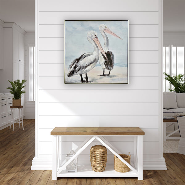 This serene painting captures a pair of pelicans standing gracefully by the shoreline, their large beaks and soft feathers beautifully highlighted against a tranquil backdrop. The muted tones of the sky and water create a calming atmosphere, allowing the birds to stand out with their elegant, poised forms. The artist’s delicate brushstrokes emphasize the texture of their plumage, while the gentle blending of colors evokes the peacefulness of a coastal scene. This artwork is a perfect piece for those who appreciate the quiet beauty of nature and the majesty of coastal wildlife.