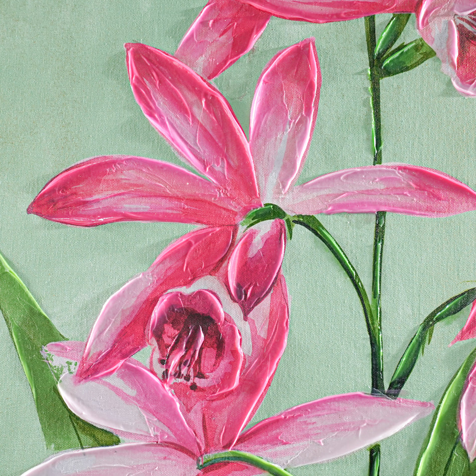 This exquisite floral artwork by American artist Shay exemplifies her signature mastery of texture and vibrant colour. Showcasing vivid pink blossoms against a serene green backdrop, the piece reflects Shay’s journey from Cordon Bleu chef to celebrated painter. Infused with the timeless charm of French Provence, her work captures the emotional essence of nature. Each brushstroke conveys depth and passion, making this artwork a statement piece for any space.