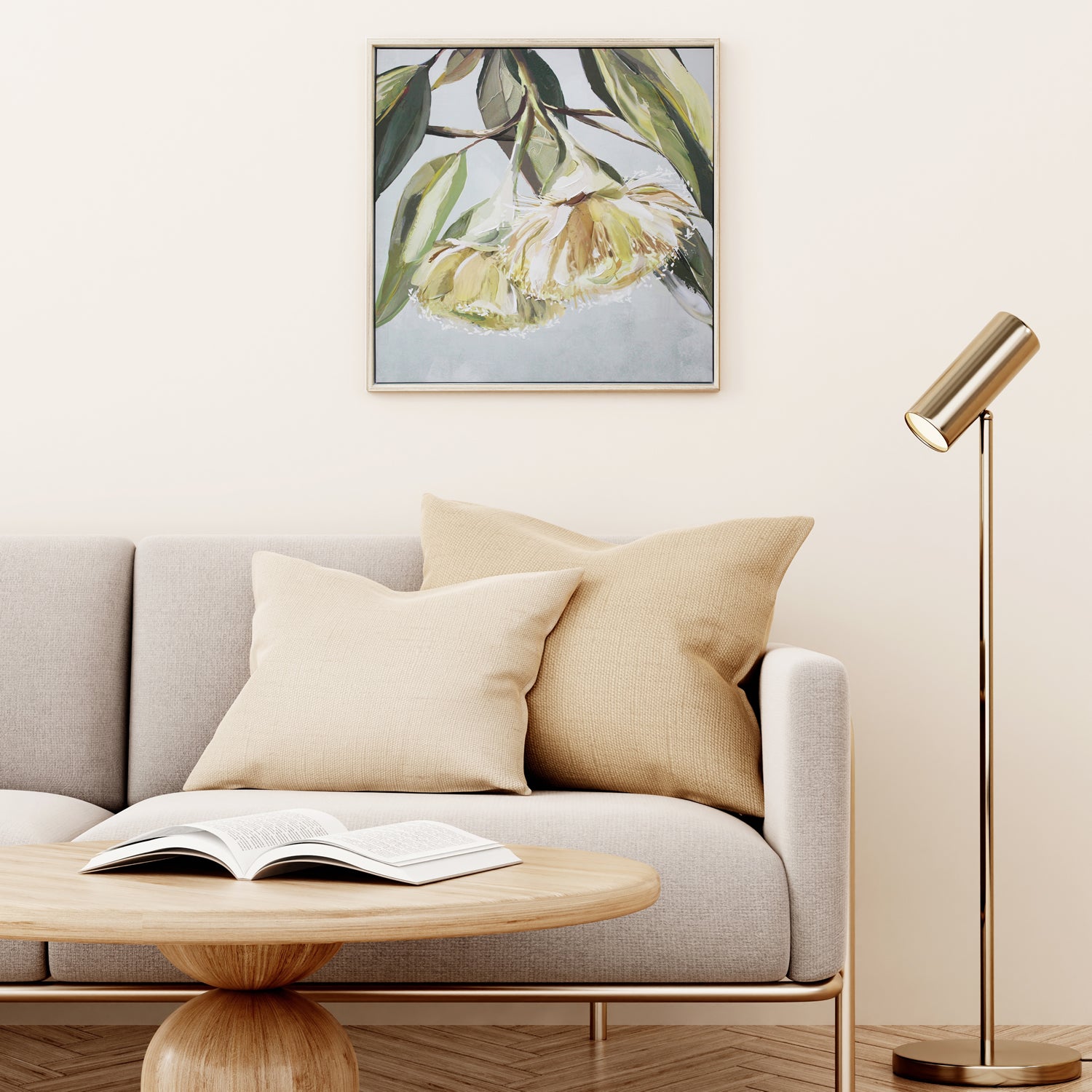 This captivating painting focuses on the delicate beauty of eucalyptus blossoms, with their signature soft, feathery petals rendered in warm, earthy tones of cream and yellow. The leaves surrounding the flowers are depicted with rich shades of green, creating a natural and organic composition. The artist's use of bold brushstrokes and textured layers adds depth and movement to the piece, evoking the gentle sway of the blossoms in a breeze. This artwork beautifully captures the essence of the Australian bush, bringing a touch of nature’s grace and vitality into any space.