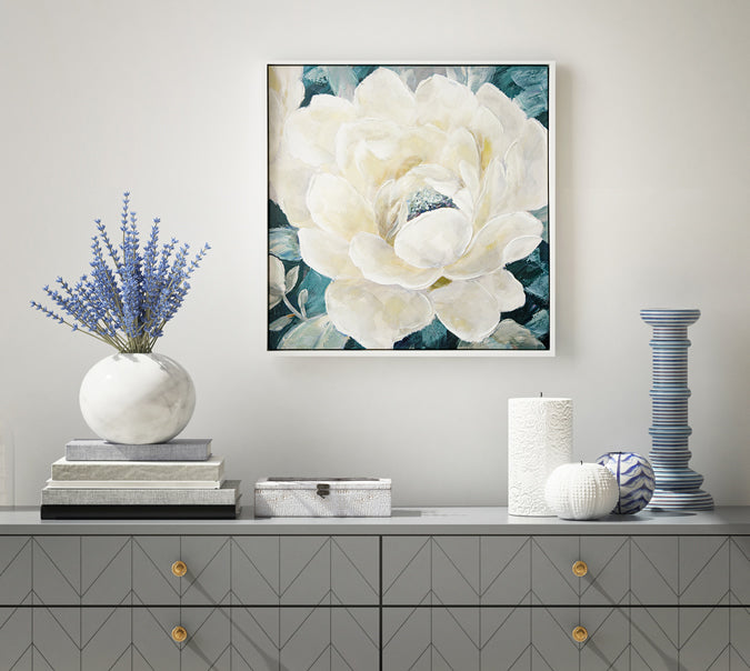 Solar Flower Painting Inspired By Floral Themes Giving And Living Space A Contemporary Feel. Printed On Canvas And Hand Painted To Give Texture And Depth, With White Polyresin Frame. Supplied ready to hang with a string on the back.