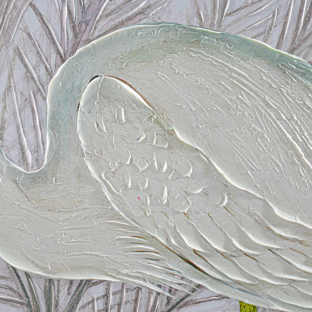 This exquisite artwork by Shay, an acclaimed American artist, captures the elegance of a heron against a serene botanical backdrop. Shay’s textured brushstrokes bring the heron to life, showcasing her mastery of precision and passion in her artistic journey from culinary creations to vibrant visual storytelling. The muted tones and intricate detailing of the feathers harmonise beautifully with the natural foliage, evoking the tranquillity of French Provence. Perfect for adding sophistication to any interior setting.