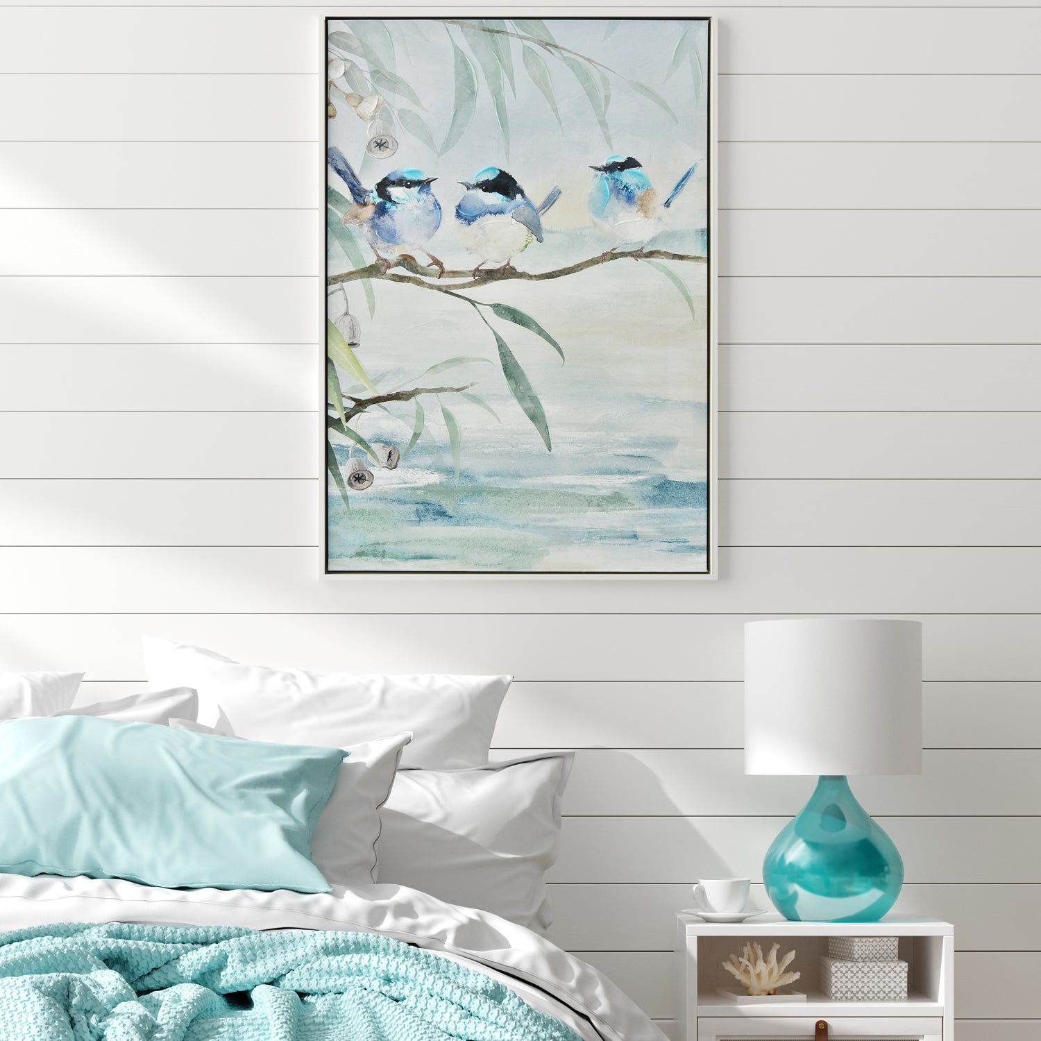 This delightful painting captures two vibrant blue wrens perched on a eucalyptus branch, surrounded by delicate gum blossoms and leaves. The artist's use of soft pastels and light, airy brushstrokes creates a serene, natural setting that evokes a peaceful Australian landscape. The vivid blues of the wrens contrast beautifully with the muted greens and grays of the foliage, bringing a playful energy to the composition. This artwork exudes charm and tranquility, making it a perfect piece for nature lovers or anyone looking to bring a touch of the outdoors into their space.