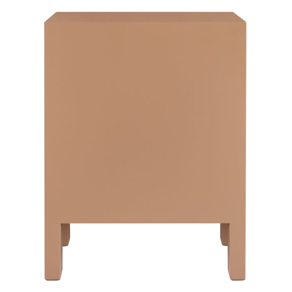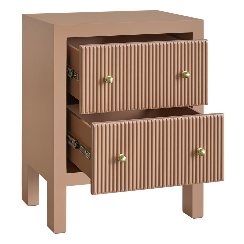 The Ariana Bedside Table Small Mocha Mousse evokes both luxury and warmth through its rich mocha tone - a hue aligned with Pantone’s 2025 Color of the Year, PANTONE 17-1230 Mocha Mousse, praised for its sensorial, grounding elegance. Pantone +2 Pantone +2 Its compact silhouette rests on slender legs for a light, elegant presence. Two drawers with vertical fluted detailing glide effortlessly on metal runners, crowned with delicate gold knobs for a subtle luxe accent. Ideal for smaller bedrooms, the Ariana merges timeless design with functional storage, making it a versatile and stylish addition to both modern and classic interiors.