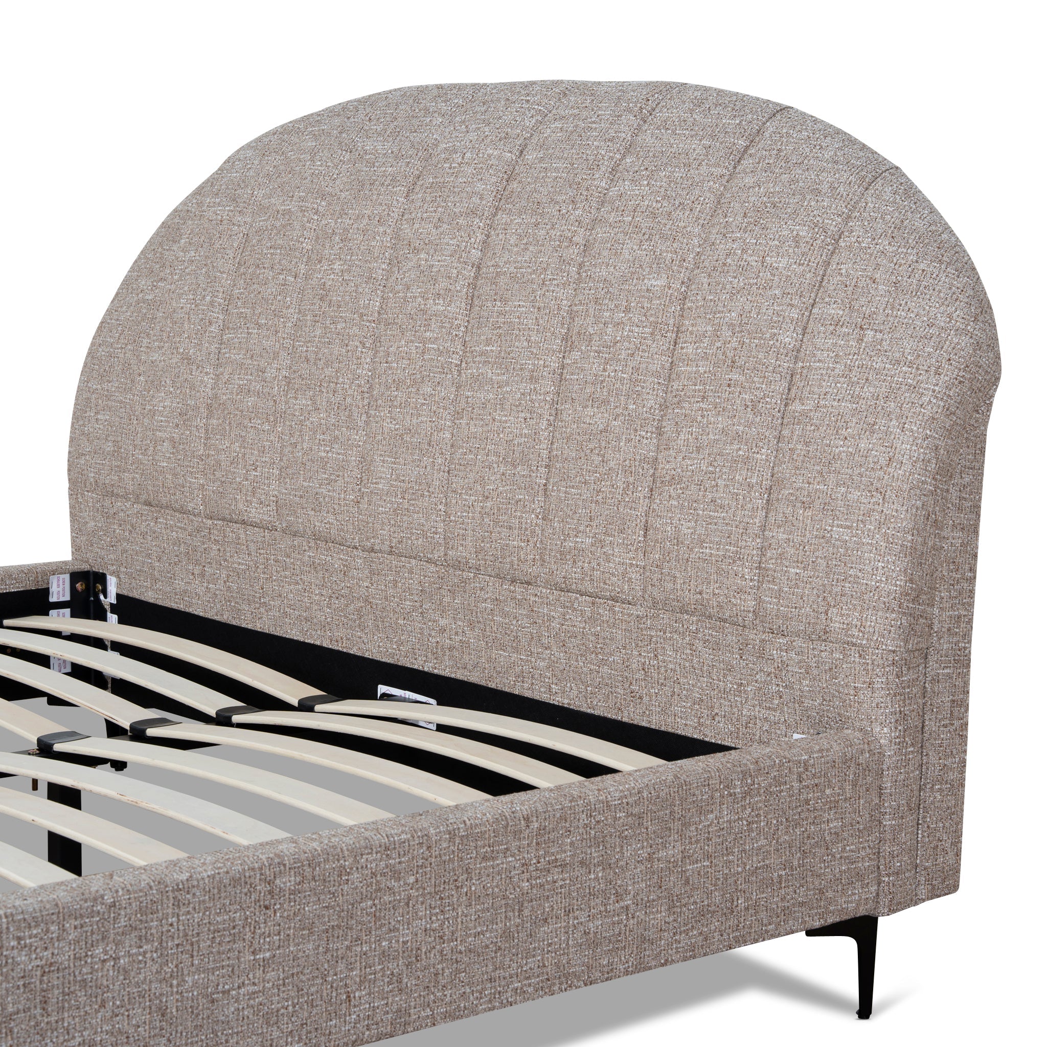 - Distinctive rounded headboard with vertical panel detailing
