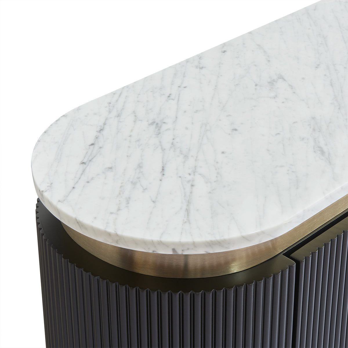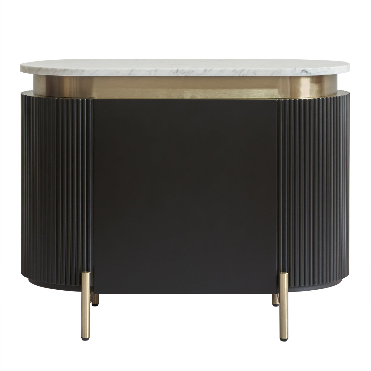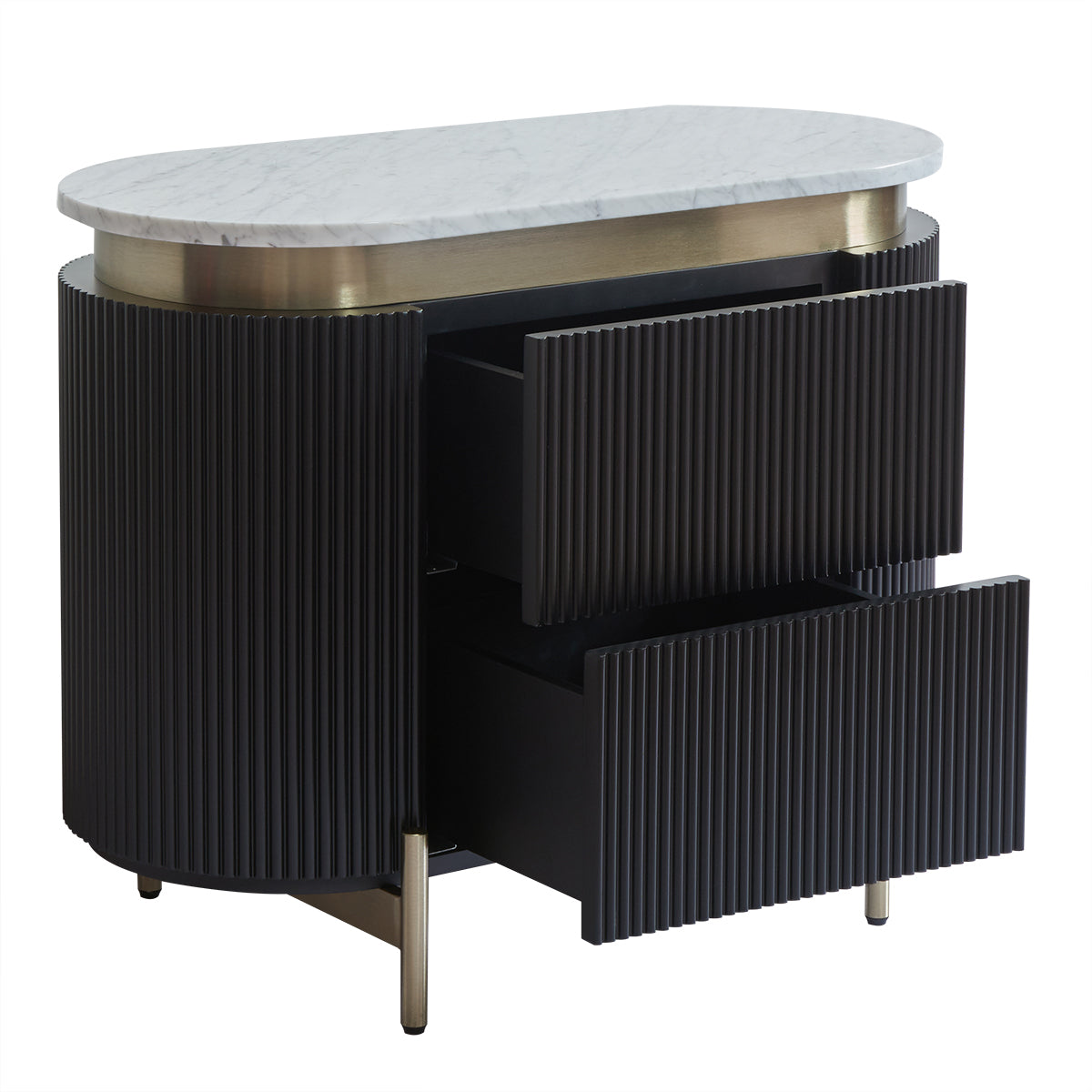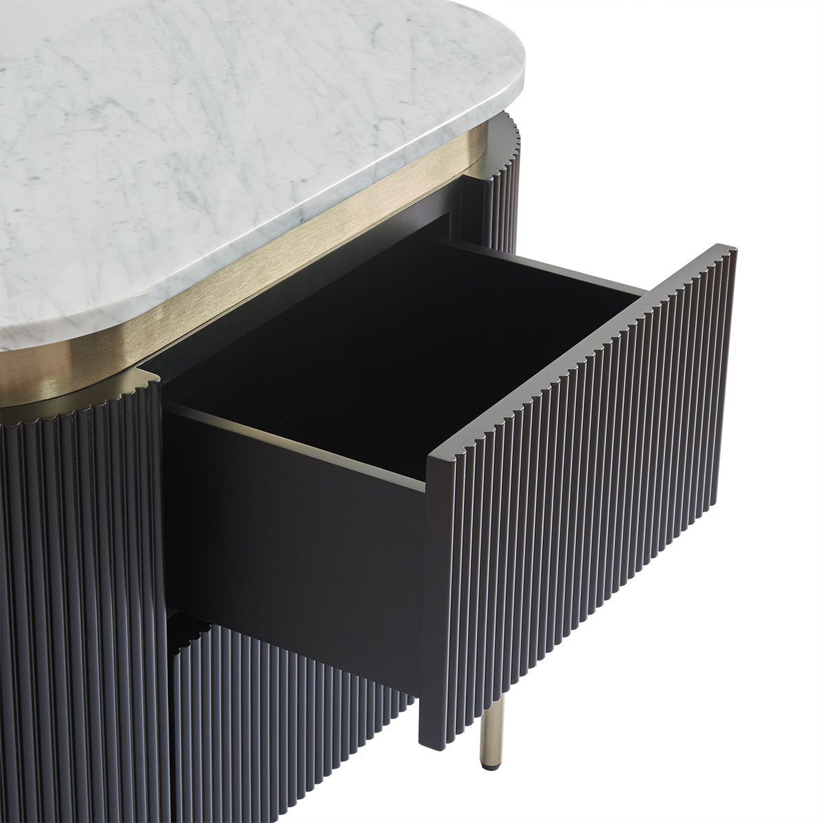An elegant blend of contemporary style and functional design, the Demarco bedside table in black boasts a mid-century modern profile with stunning ribbed detailing. Its smooth white Carrara marble top is perfectly complemented by brass-finished accents and slender iron legs. Spacious drawers provide ample storage while maintaining a sleek, sophisticated look. A refined addition to any bedroom, this piece offers a timeless touch of luxury.