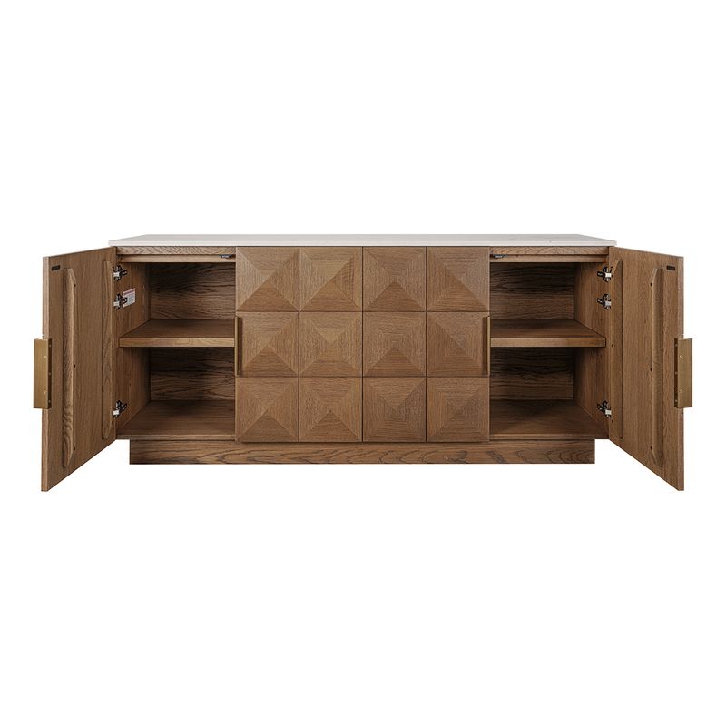 The Benedict buffet with its white marble top delivers timeless elegance, exceptional quality and impressive versatility. Paired with a sculptural geometric timber base, available in natural oak, walnut, white or smoked oak, this buffet enhances dining rooms, living areas and entryways with refined presence. The natural marble veining adds luxury and individuality, while brass handles provide warm contrast. Inside, generous storage keeps spaces organised with ease. Loved by interior designers, this piece offers premium craftsmanship, modern texture and a sophisticated storage solution that transitions seamlessly across diverse interior styles and colour palettes.