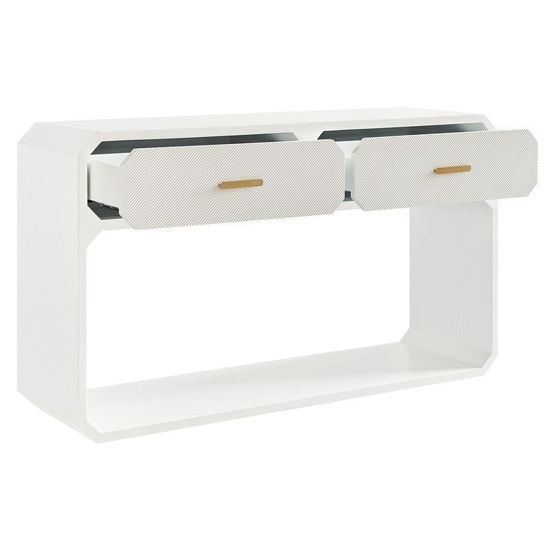 The Anderson Console Table - White introduces a fresh and versatile elegance to contemporary interiors. Finished in a crisp white painted ashwood veneer, its bold yet refined silhouette offers ample scale for display and storage. Two drawers, detailed with subtle diagonal texturing and smooth metal runners, are finished with brushed gold handles for a luxe touch. An open base highlights its architectural lines, making it an elegant and practical addition to hallways, entryways, or living spaces.