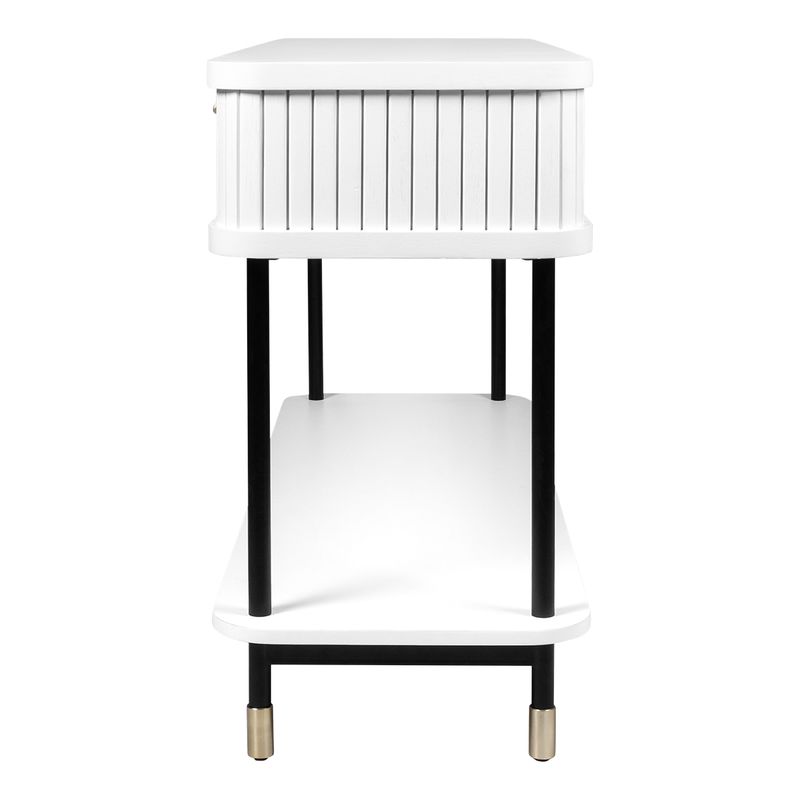 The Sophia Console Table in White is a refined accent piece that blends modern elegance with functional design. Featuring vertical fluted panelling, sleek brass handles, and slim black legs with brass-capped feet, it creates a sophisticated focal point for hallways, entryways, or living spaces. A spacious surface and open lower shelf provide practical storage and display options, while its streamlined silhouette enhances both contemporary and transitional interiors. Also available in Black and Oak Natural finishes to suit a variety of styles.