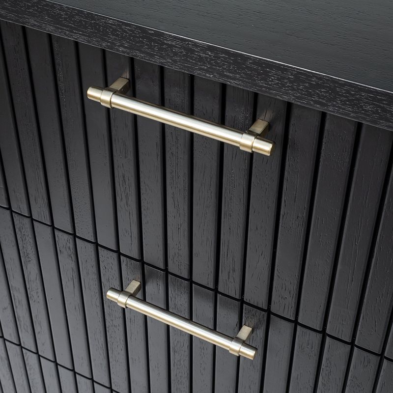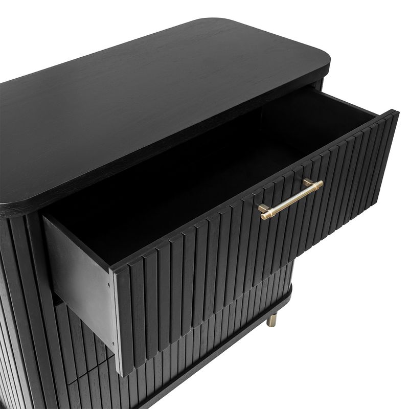 The Sophia 3 Drawer Chest in black combines contemporary elegance with practical storage, making it a versatile choice for both residential and commercial interiors. Its bold fluted façade, finished in painted black, creates a striking statement, while three spacious drawers glide smoothly on soft-closing runners for seamless functionality. Slim brass handles and brass-capped legs add a refined touch of luxury, enhancing its timeless appeal. Perfect for bedrooms, living spaces or boutique projects, this chest balances form and function. Also available in white and natural oak finishes.