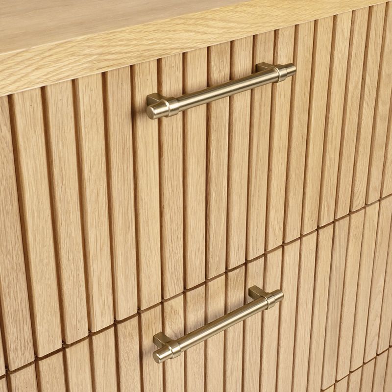 Elevate your interior with the Sophia 3 Drawer Chest, a refined statement from the elegant Sophia Range. Featuring vertical fluted detailing, brushed gold handles, and slim legs with brass-capped feet, it blends timeless elegance with a contemporary edge. This sophisticated silhouette offers generous storage perfect for bedrooms, hallways, or living spaces. Available in three stunning finishes Black, White, and Oak Natural—the Sophia Chest brings modern versatility and style to any room.