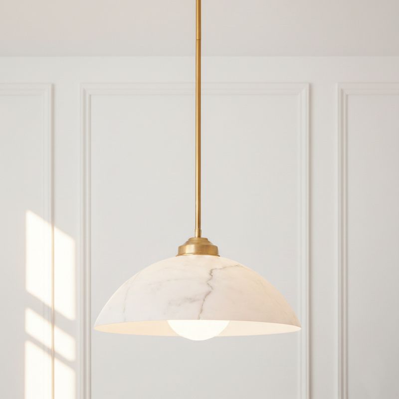 The Bryson Pendant Light brings sculptural elegance to contemporary interiors. Featuring a smooth half-dome shade with an alabaster-look finish and natural veining detail, it captures the timeless beauty of stone without the weight. A brushed brass rod and canopy add a touch of warmth and sophistication, creating a refined balance of texture and tone. Perfect for kitchens, dining areas, or hallways, the Bryson Pendant casts a soft, ambient glow that enhances any space with understated luxury.