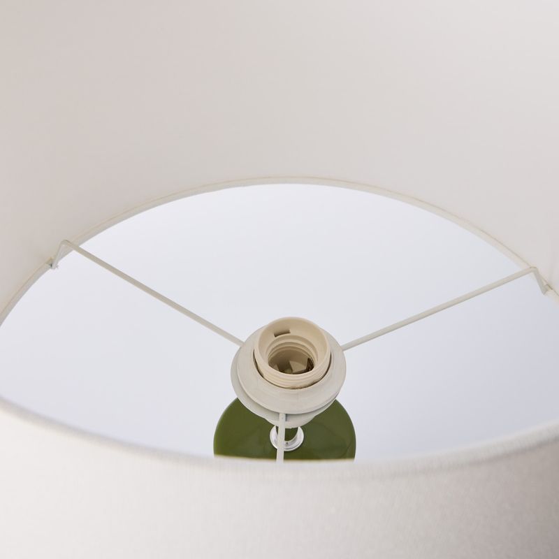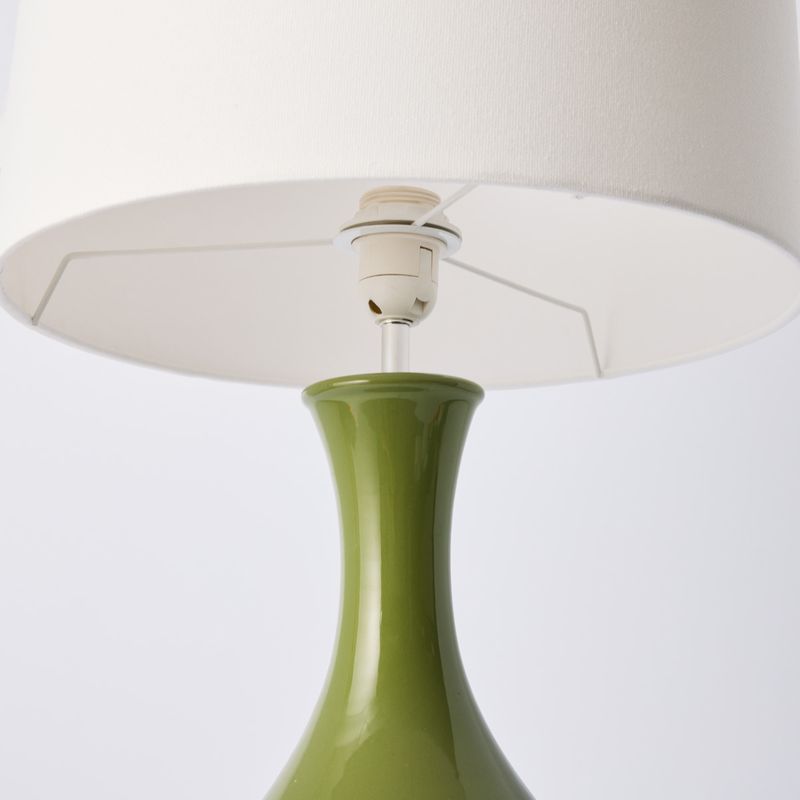The Phoebe Table Lamp - Olive introduces sculptural elegance with a glossy ceramic base in a fresh olive green, paired with an off-white faux linen drum shade. Its fluid curves and reflective surface bring a sophisticated accent that enhances light and atmosphere in any interior. Perfect for styling on bedsides, hallway consoles, or living room side tables, it casts a soft ambient glow while adding height and presence. A versatile choice that complements both classic and contemporary interiors. Also available in White.
