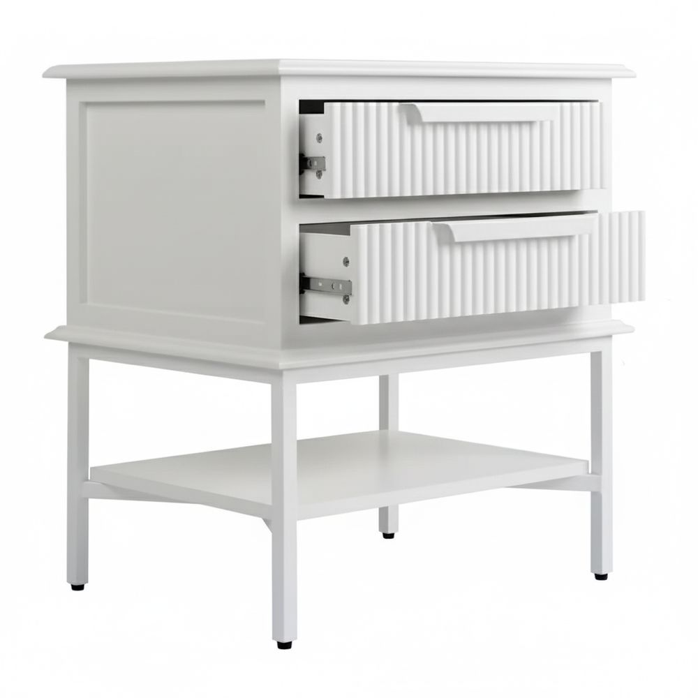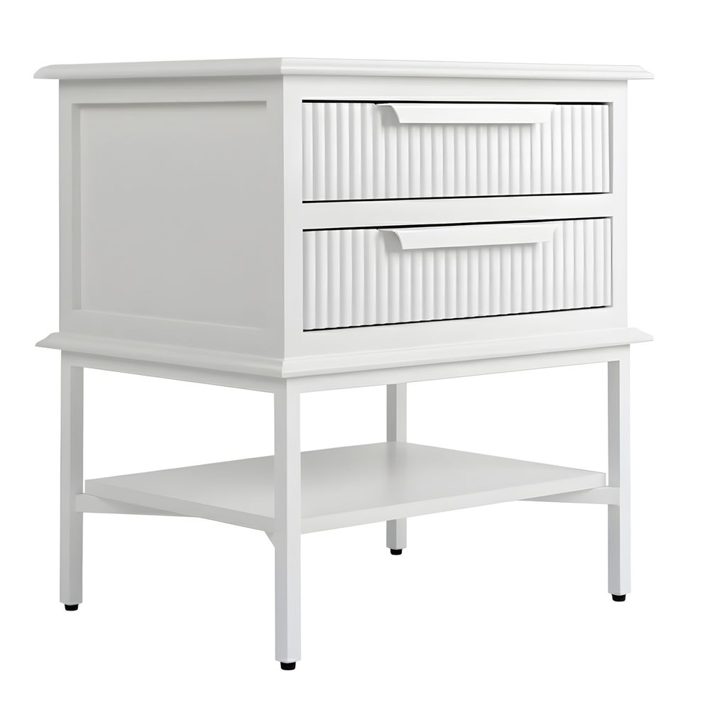 Compact in size yet full of character, the Aimee Bedside Table - Small brings refined detail and sculptural appeal to modern bedroom spaces. Featuring ribbed drawer fronts, bold rectangular handles, and an open shelf base, it offers a balance of practical storage and statement design. Finished in a fully colour-matched All White or All Black palette, it creates a sleek, monochrome look that pairs effortlessly with contemporary interiors.