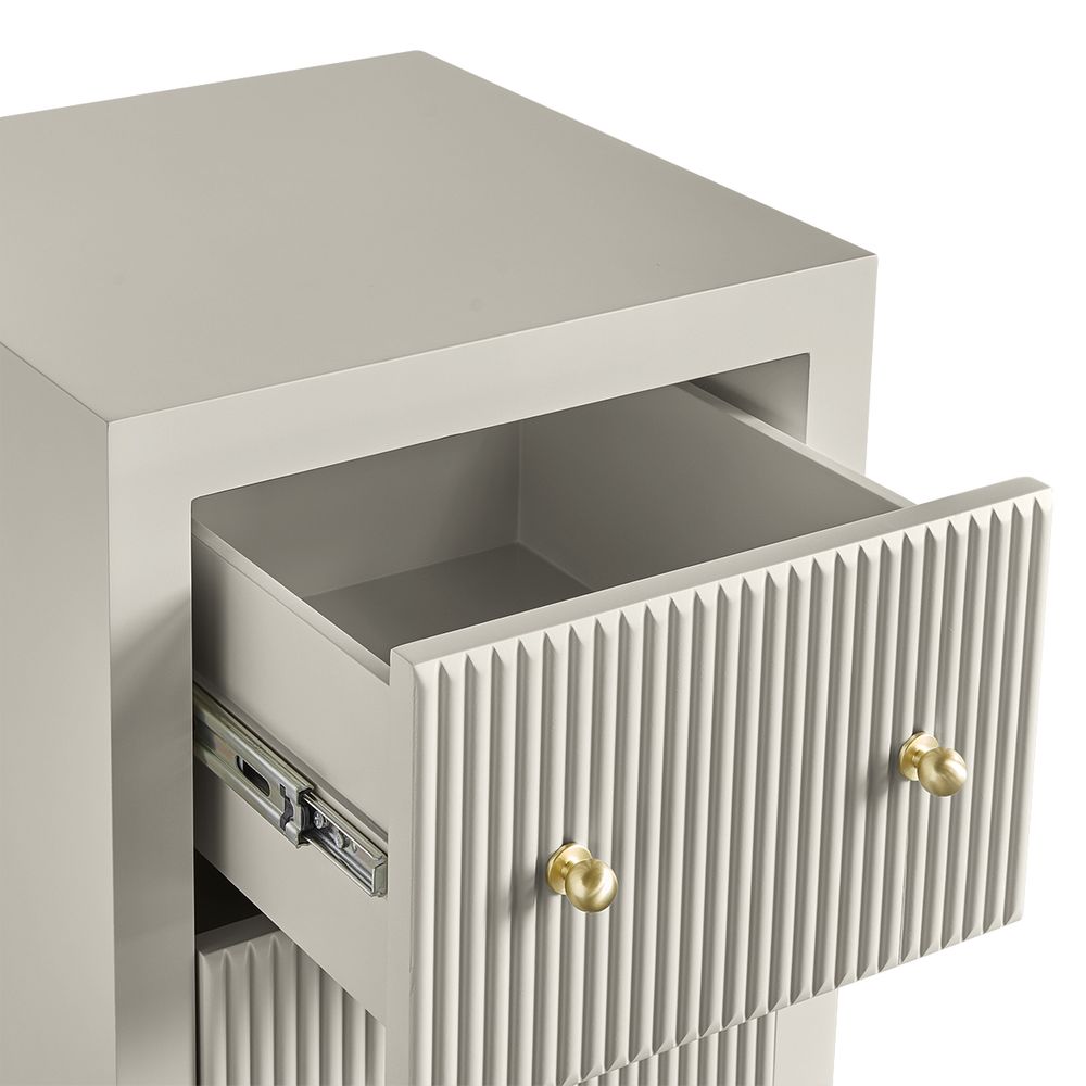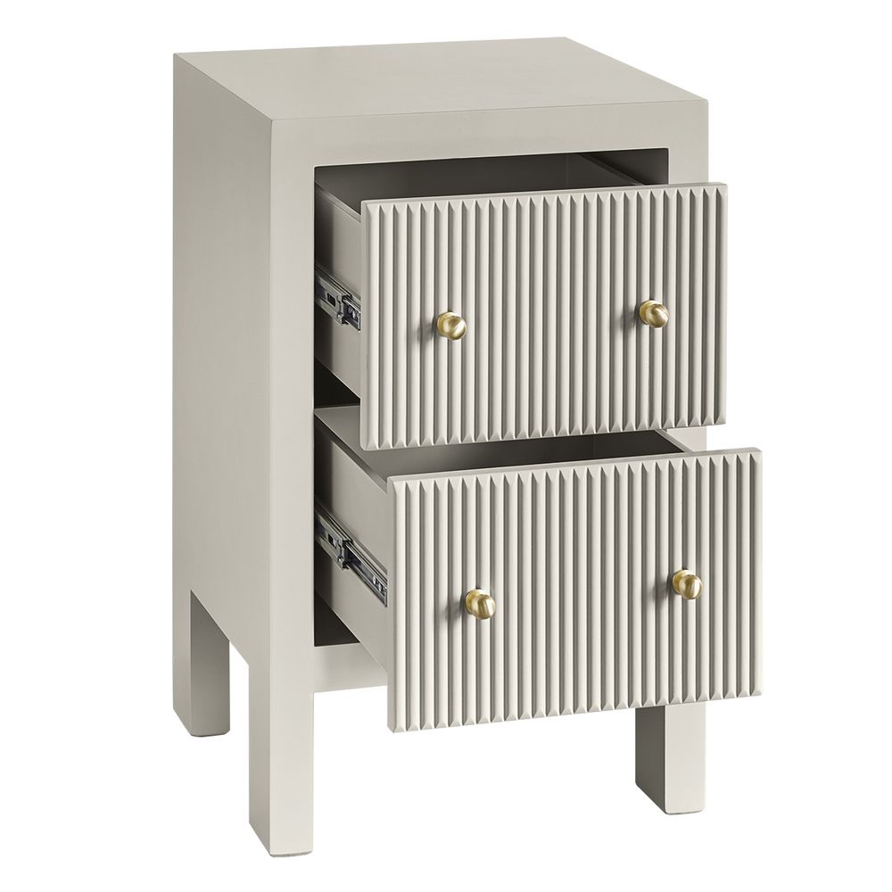 The Ariana Bedside Table Petite Grey offers a balance of compact elegance and practical storage. Finished in a soft grey tone, its refined silhouette is lifted on slender legs for a light, contemporary presence. Two drawers with vertical fluted detailing glide smoothly on durable metal runners, complemented by brushed brass knobs for a sophisticated accent. Designed to suit smaller spaces, the Ariana combines timeless style with everyday functionality, making it a versatile addition to both modern and classic bedroom interiors.