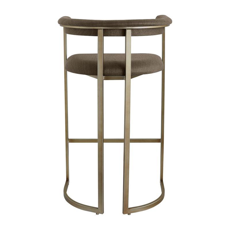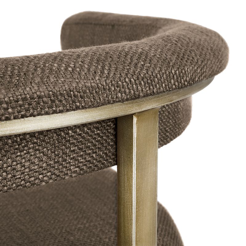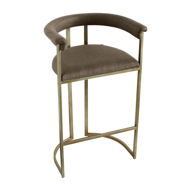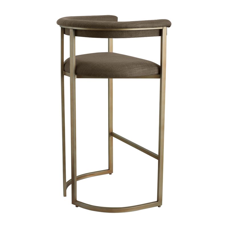 The Dino Bar Stool offers a sophisticated silhouette tailored for bar-height spaces. Wrapped in chocolate linen, the curved backrest and padded seat provide a comfortable and elegant perch, ideal for entertaining or everyday use. Its antique brass finished frame enhances the design with modern warmth and durability. Thoughtfully scaled for elevated counters and bar tops, the Dino Bar Stool completes the cohesive look of the Dino Range. Also available in Natural linen.