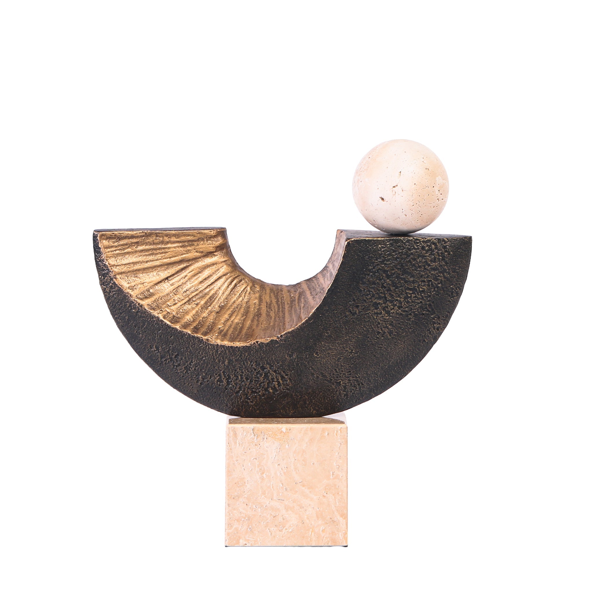 - Mounted on a solid travertine base with natural pits and warm beige tones
