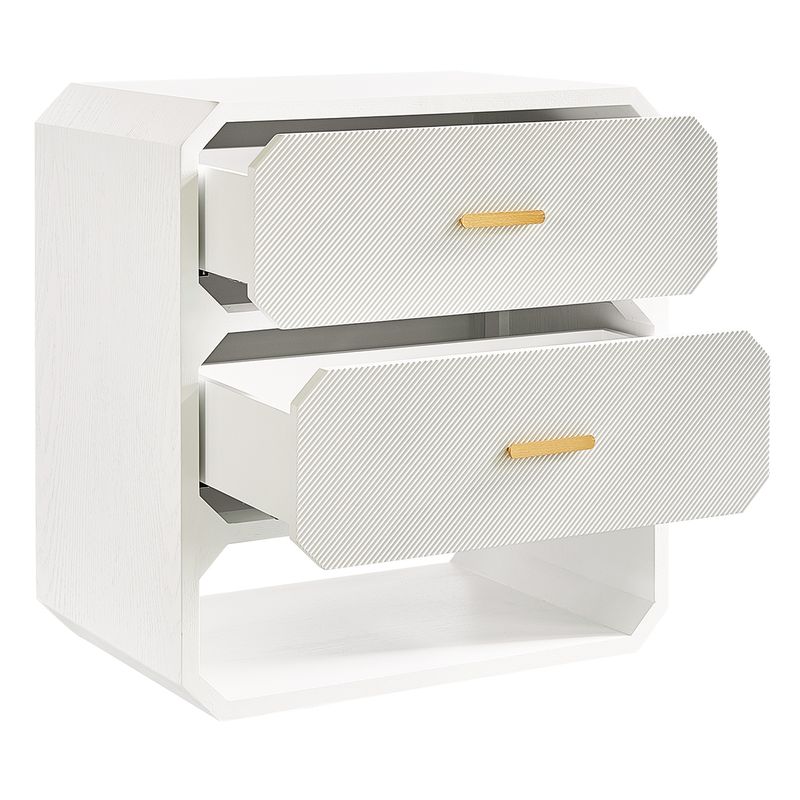 The Anderson 2 Drawer Chest - White combines clean elegance with everyday practicality. Crafted in ashwood veneer with a crisp painted white finish, its refined silhouette measures 70cm wide, 50cm deep and 80cm high, offering generous storage with understated style. Two drawers with subtle diagonal texturing glide seamlessly on durable metal runners, accented by sleek gold handles for a sophisticated touch. Balancing timeless design with functional appeal, this chest adapts effortlessly to both classic and modern interiors. Also available in Black and Antique Gold.