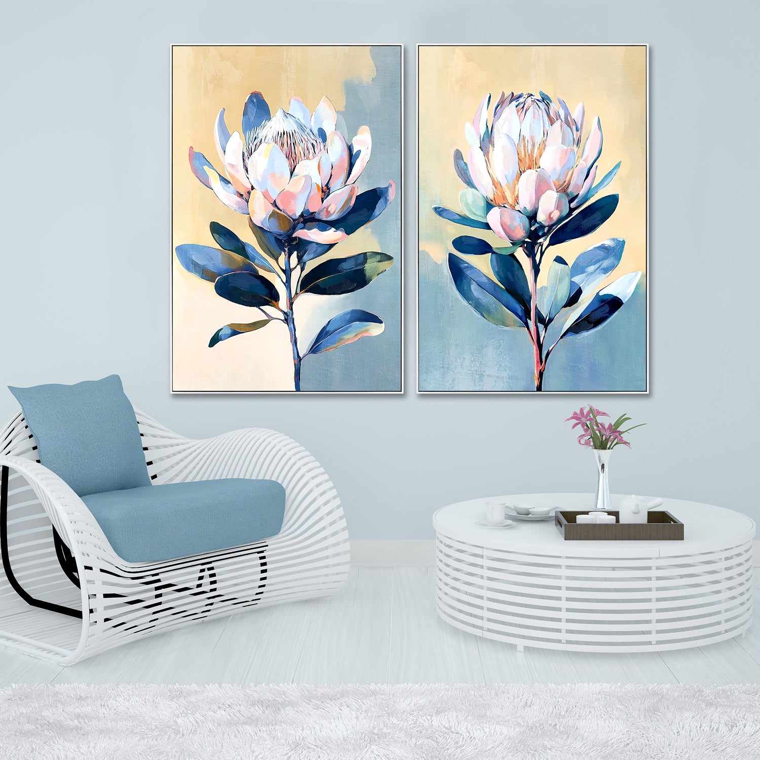 Striking and contemporary, this artwork features a bold interpretation of the native protea flower. Painted in vibrant tones of blush, indigo, peach, and soft cream, the layered petals and broad leaves stand out against a softly blended background of golden ochre and cool slate blue. The strong composition and rich colour palette give this piece a modern edge while maintaining a sense of natural beauty. Ideal for adding a pop of colour and botanical elegance to any space.