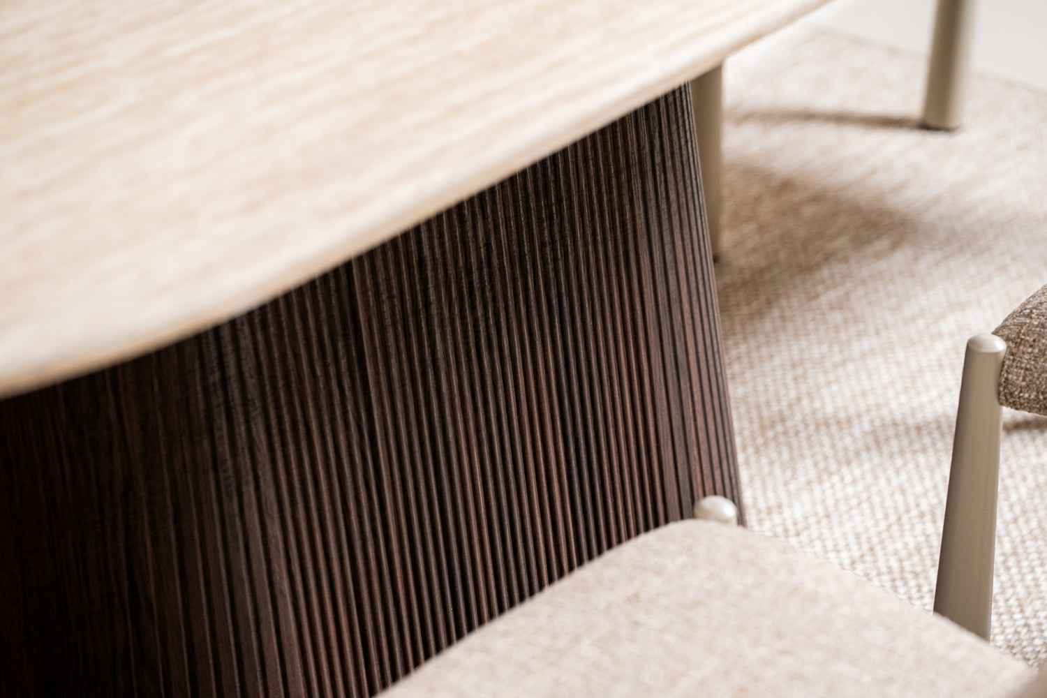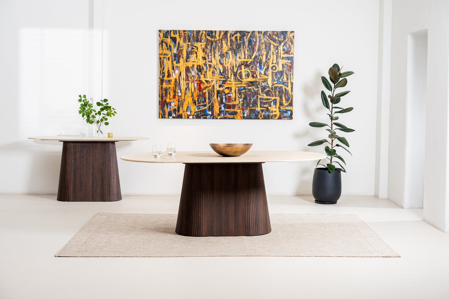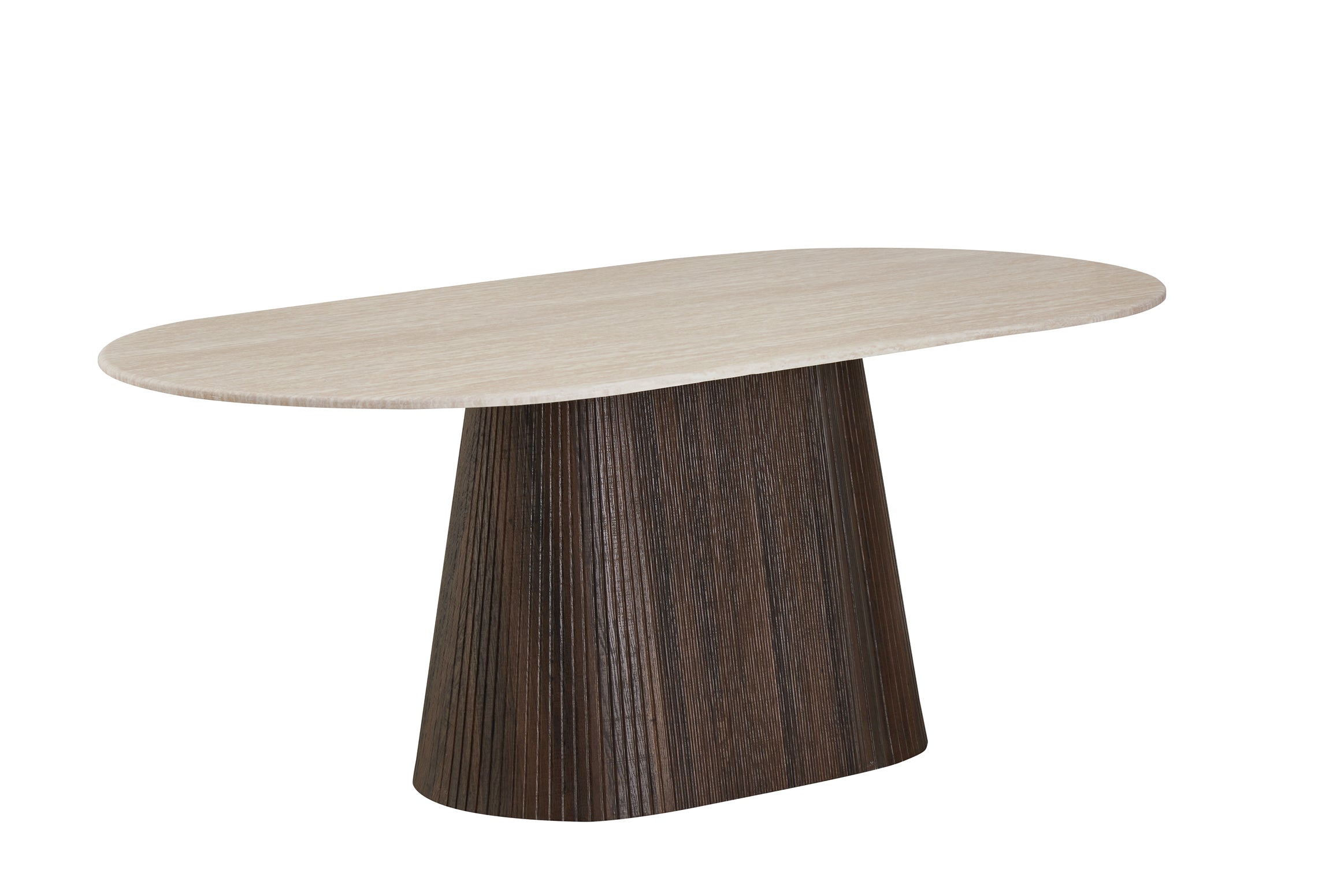 Elevate your dining experience with this elegant dining table, featuring a luxurious stone top with a refined travertine finish. The smooth, sophisticated surface brings timeless charm to your dining space, while the sturdy corrugated MDF base, finished in a rich espresso tone, adds depth and contrast to the design. This table's blend of modern style and classic appeal makes it the perfect centerpiece for contemporary dining rooms, offering both durability and beauty for everyday use or special occasions.