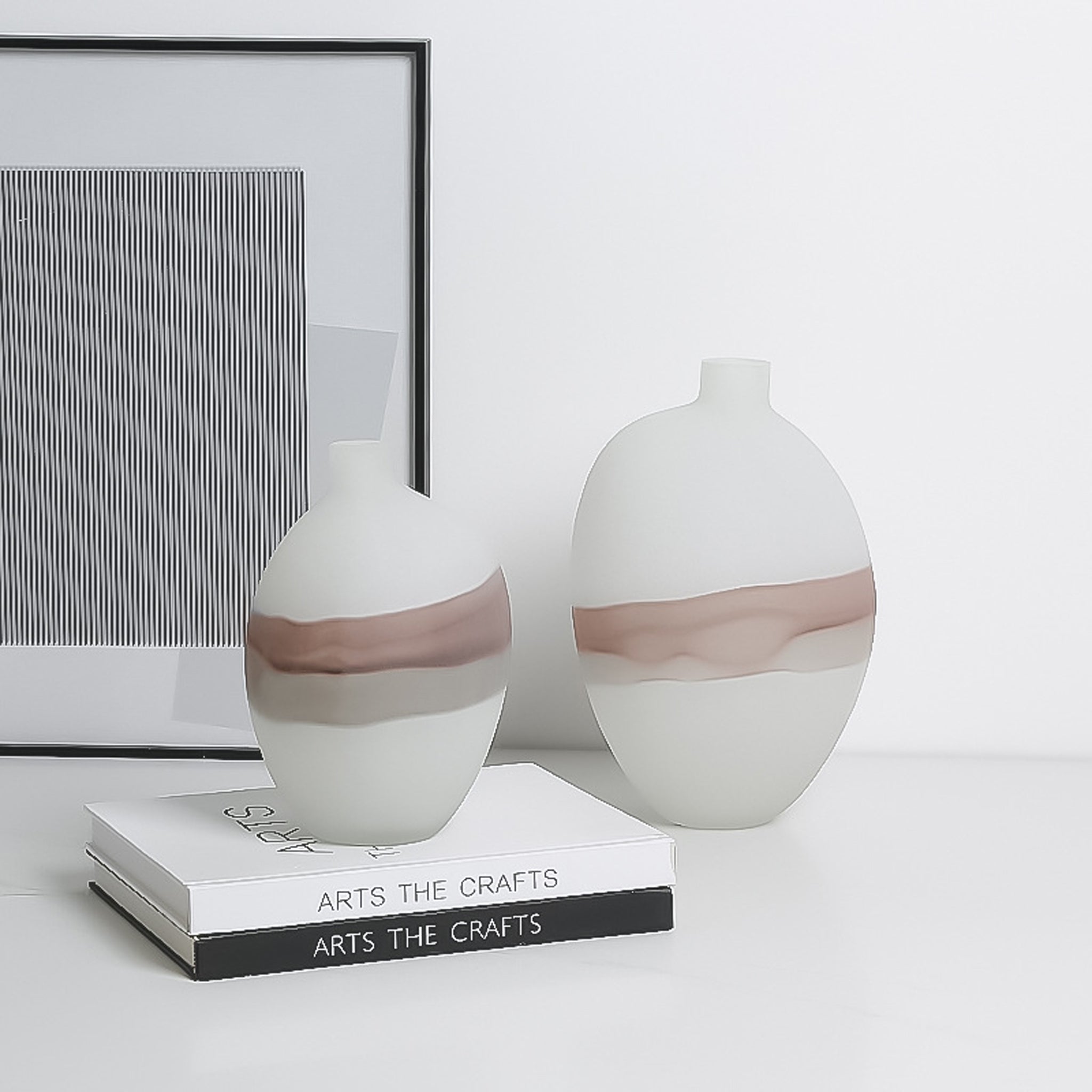 - White base accented with a soft flowing band of blush-pink and taupe tones