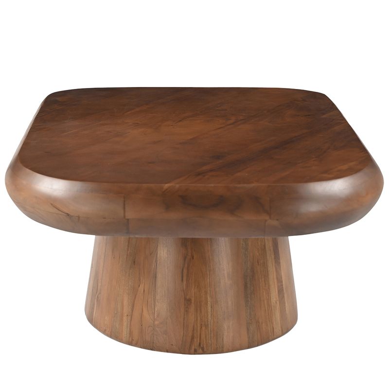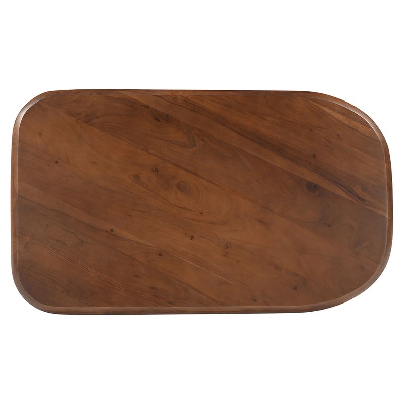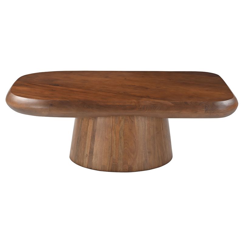 Featuring a curved pill-shaped top and wide pedestal base, this Haimes Coffee Table in solid acacia wood blends organic form with architectural structure. It offers a bold, sculptural centrepiece for contemporary living rooms. The rich stained finish enhances its visual depth, while the streamlined silhouette adds modern sophistication. Designed for both style and everyday function, it complements a wide range of interiors with its timeless yet statement-making design.