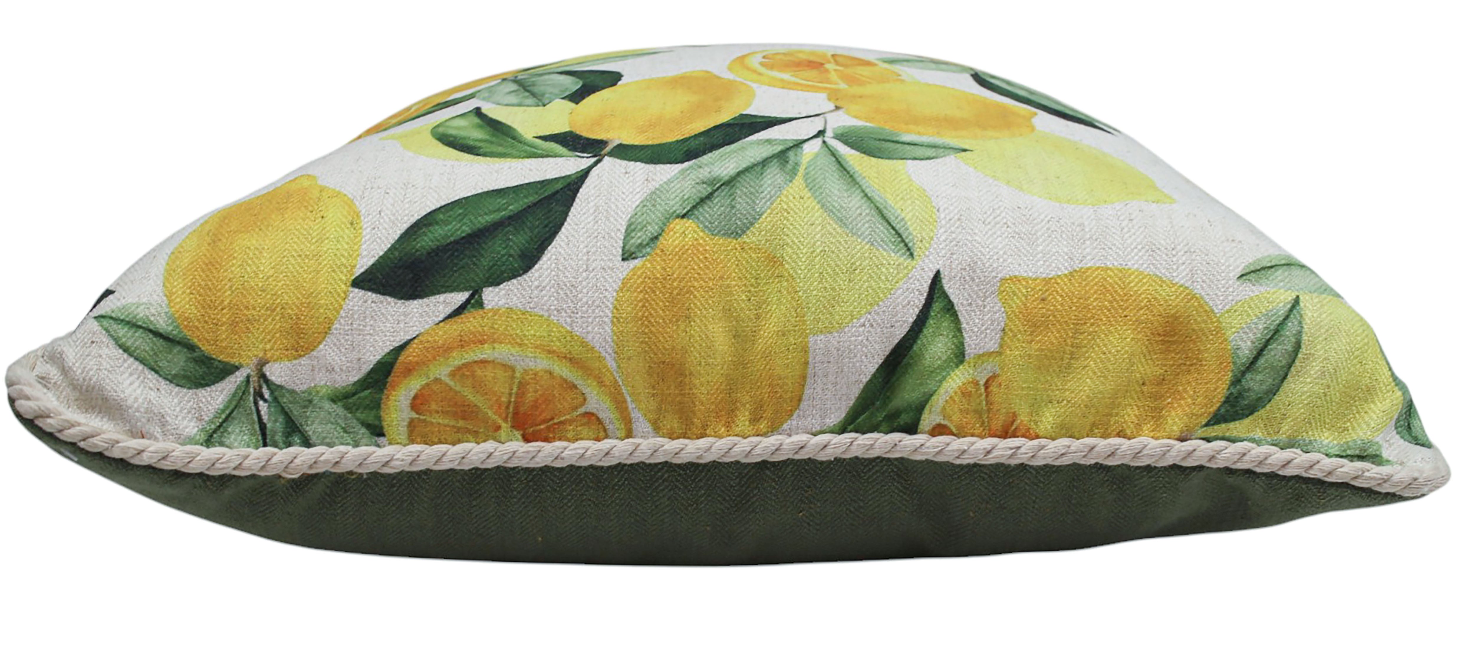 This cushion brings a burst of sunshine to any space with its vibrant lemon print and lush green leaves. The natural linen-style backdrop enhances the bright, painterly artwork, giving it a crisp, summery feel. Perfect for adding a cheerful pop of colour to kitchens, outdoor settings, or relaxed living spaces.