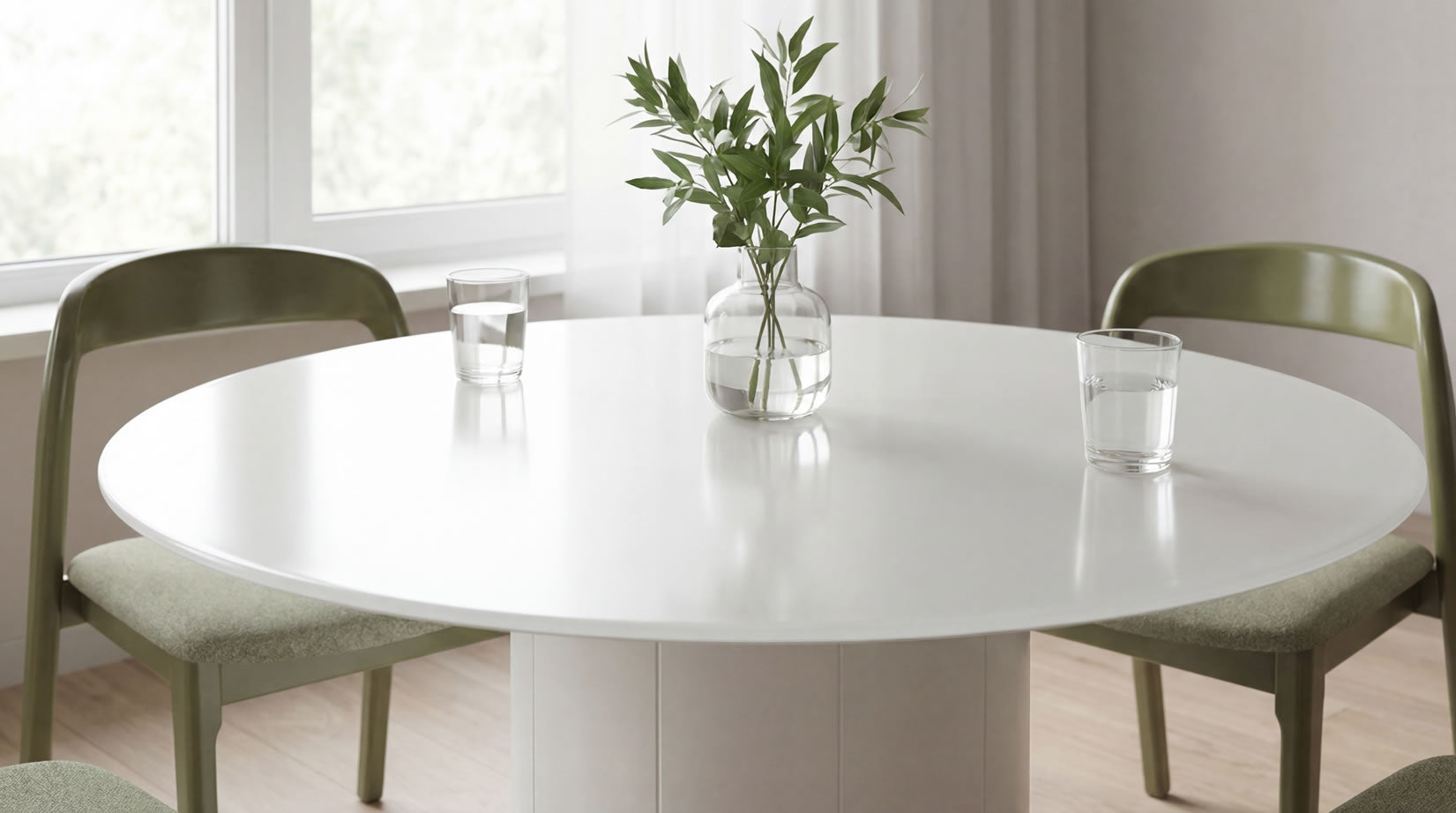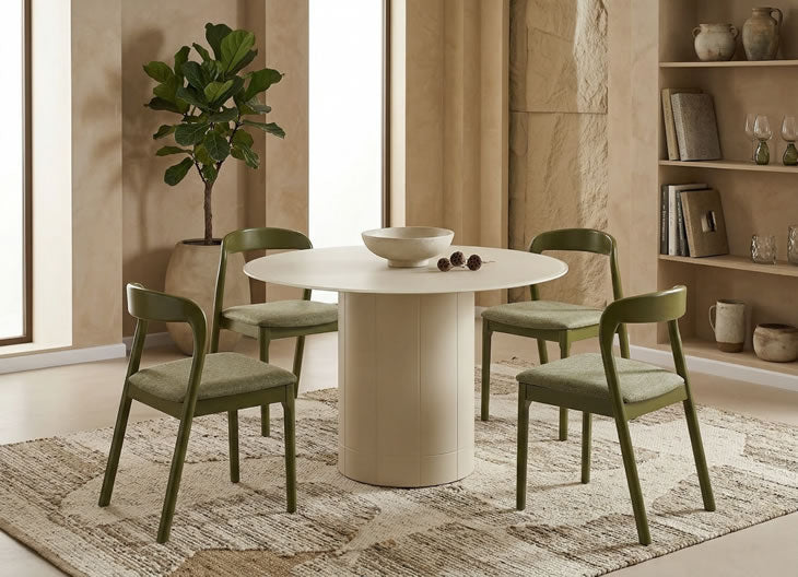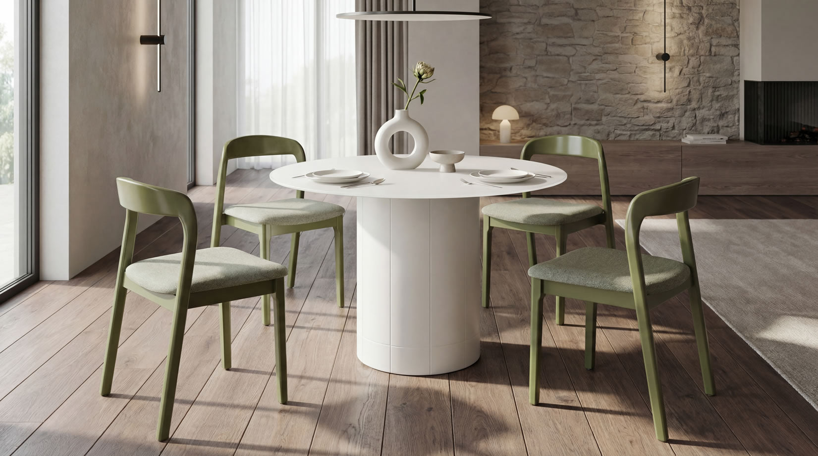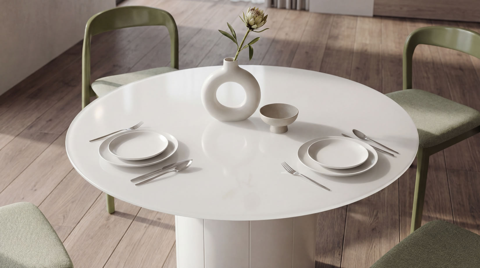 Rimini celebrates connection through its round silhouette. The pedestal base allows flexible seating while maintaining a clean, uninterrupted form. The matte glass surface enhances light diffusion and brings softness to the overall design. Whether in warm Chestnut or light Tofu finishes, Rimini adapts effortlessly to contemporary interiors.