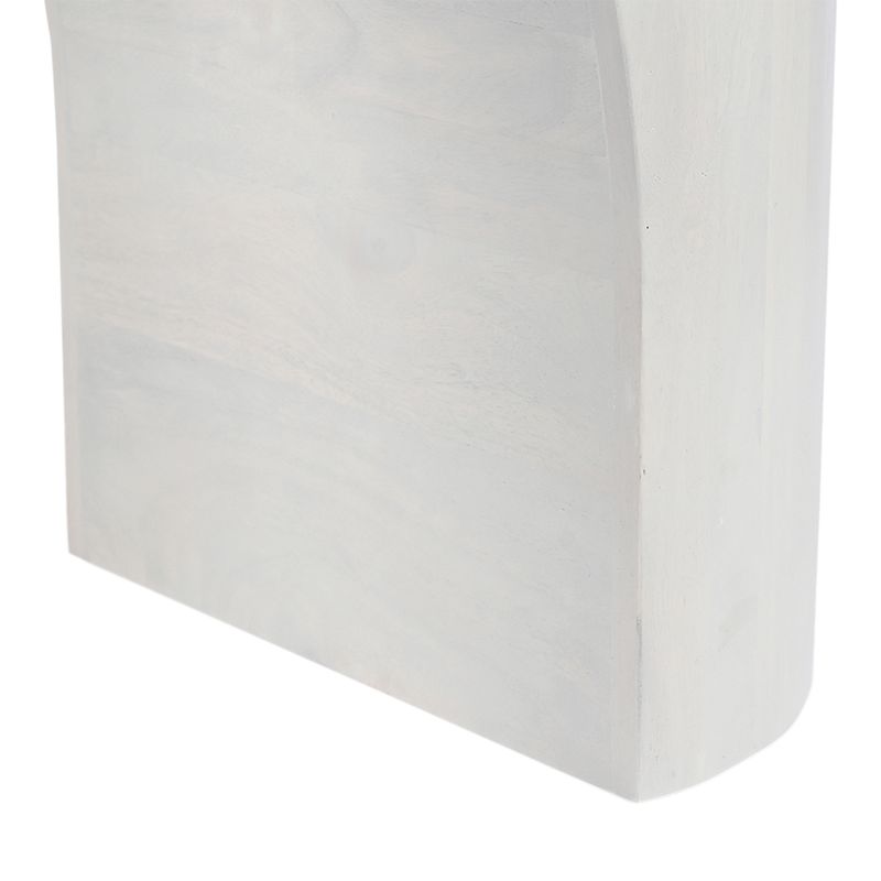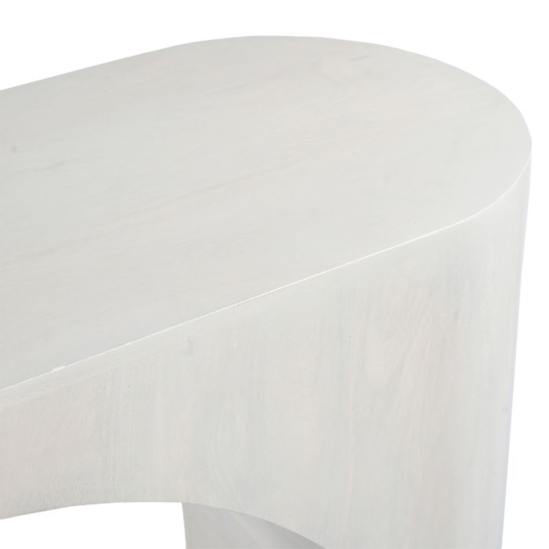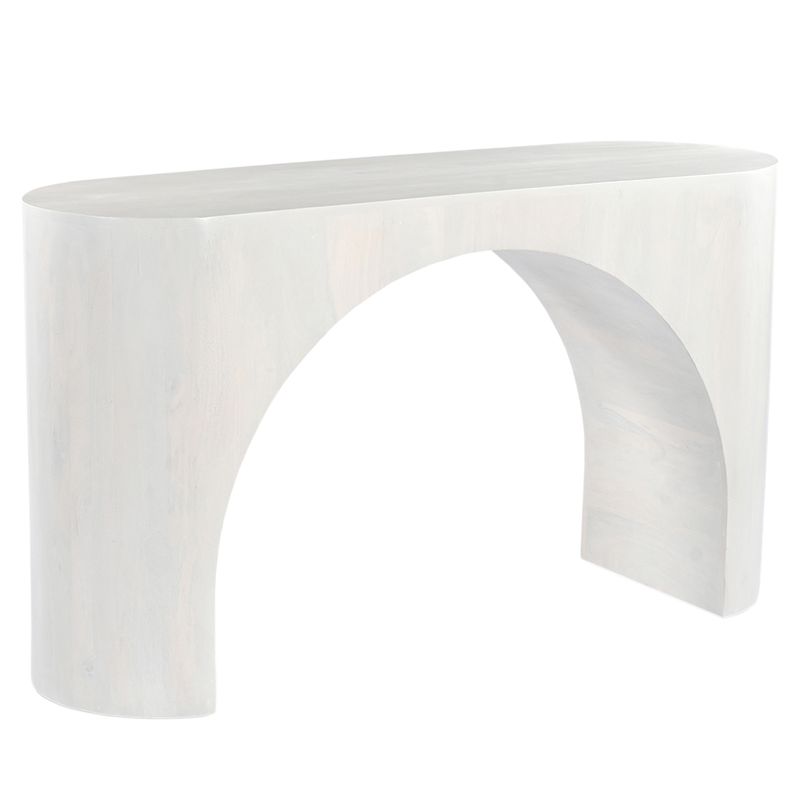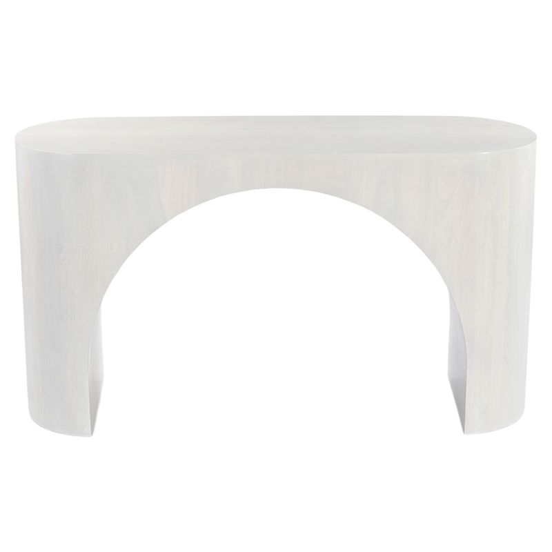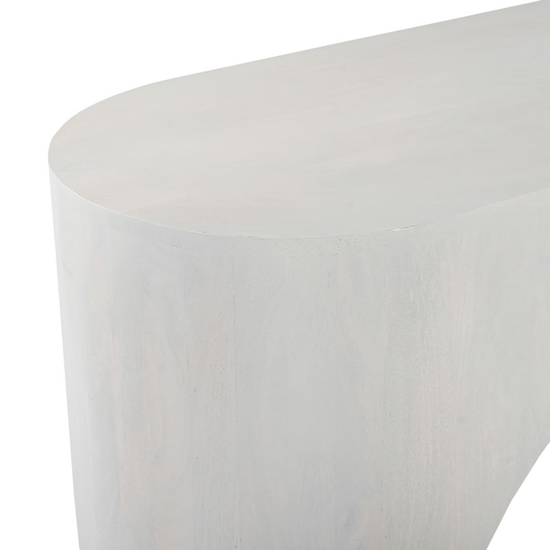 With its minimalist form and architectural detailing, the Willa Console Table makes a sculptural statement, part of the new Willa range. Crafted from solid mango wood in a stained white finish, it features a gently curved oval top supported by a bold arched base. Designed to bring natural texture and modern character to entryways or living spaces, this console adds visual impact while maintaining a clean, refined silhouette.